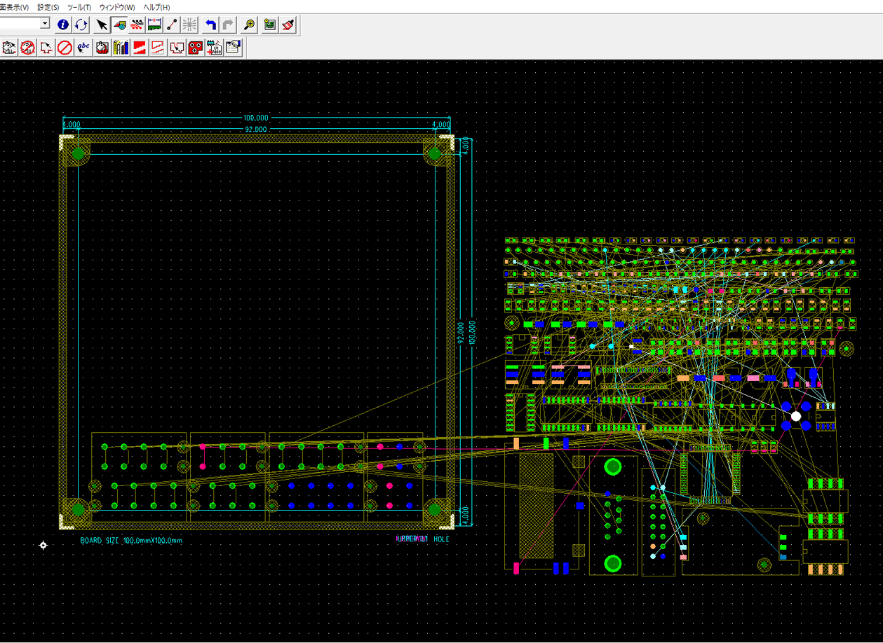 ライブラリに登録した使用部品データを呼び出してネットリストを取り込みます。画面上の細い線はラッツといい、ネットの繋がりを示しています。